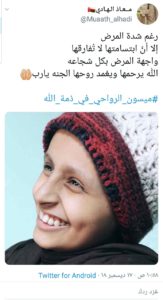 ووصف معاذ الهادي الفقيدة الراحلة بالقول: رغم شدة المرض إلا أن ابتسامتها لا تُفارقها.. واجهت المرض بكل شجاعة، الله يرحمها ويغمد روحها الجنة.