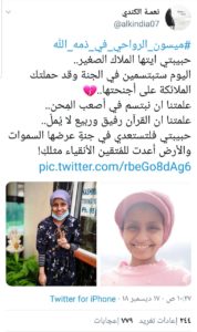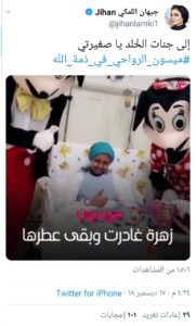 وقد غردت الإعلامية جيهان اللمكي: إلى جنات الخلد يا صغيرتي.