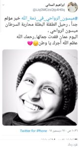 وغرد إبراهيم السناني: خبر مؤلم جداً، رحيل الطفلة البطلة محاربة السرطان ميسون الرواحي، اليوم عمان فقدت جمالها .. رحمك الله.. عظم الله اجرك يا وطن.