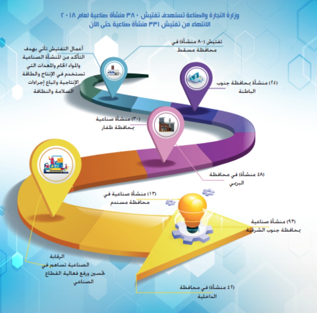 تواصل وزارة التجارة والصناعة ممثلة في المديرية العامة للصناعة أعمال التفتيش للمنشآت الصناعية لعام 2018 الذي يستهدف 380 منشأة صناعية في مختلف محافظات السلطنة بهدف تصحيح أوضاع المنشآت الصناعية وحثها على الالتزام بالقوانين واللوائح المعمول بها.