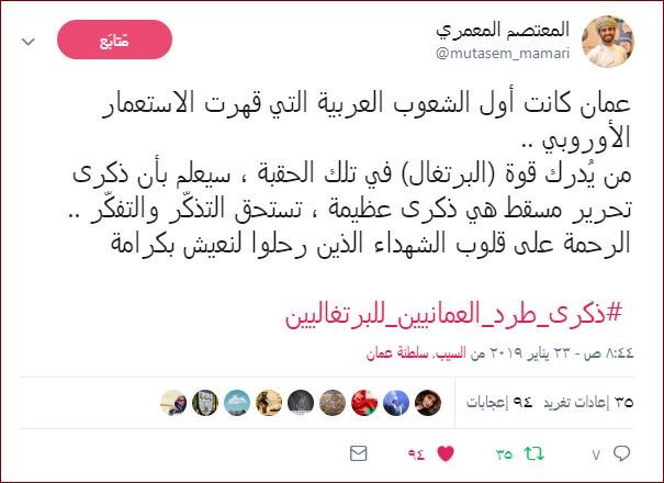 يوافق اليوم 23يناير ذكرى طرد العُمانيين للبرتغاليين من عُمان بشكل خاص ومن الجزيرة العربية بشكل عام، وفي هذا الصدد احتفى العُمانيين بهذه المناسبة، عبر مواقع التواصل الاجتماعي معبرين عن اعتزازهم وفخرهم بما حققه أجدادهم من انتصارات على الغزاة والطامعين، ومؤكدين على أن عُمان كانت ولازالت وستبقى الحصن الحصين للجزيرة العربية، وأن التراب العُماني أغلى من أرواح الجميع، والدفاع عنه أمر لا جدال فيه.