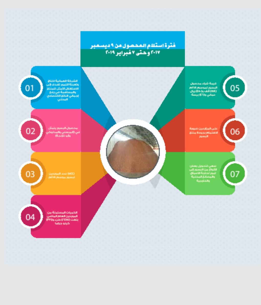 ووضح رئيس قسم البسور بوزارة التجارة والصناعة أنه تم هذا الموسم إسناد العمل للشركة العمانية لإنتاج وتعبئة التمور التي ستقوم بأعمال المناولة والتجهيز والتسويق والبيع لمحصول البسور لعام 2018م، مبينًا أن الشركة تعد متخصصة في إنتاج وتجميع وتخزين وتصنيع التمور ومشتقاتها وتخطط لاستثمار رأسمال على مدى السنوات الخمس القادمة للوصول إلى طاقة إنتاجية مناسبة من التمور ومعجون التمر والدبس.