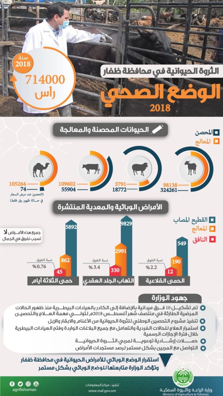 وتوضح المعلومات أن الأمراض الوبائية والمعدية المنتشرة في محافظة ظفار خلال عام 2018م هي الحمى القلاعية والتهاب الجلد العقدي وحمى الثلاثة أيام وقد سجلت العيادات البيطرية المختلفة بالمحافظة علاج عدد (4042) رأسا من الحالات المصابة ونفوق عدد (387) رأسا، وأن هذه الأمراض لا تسبب نفوق في الجمال.