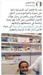 وكتب المغرد عماد الحضري: كنت إذا قابلته أجد الابتسامة دائما على محياه والتواضع وحسن الخلق، نتعلم الدروس والعبر من رحيل هؤلاء الأخيار المكافحين ممن كانت لهم بصمة واضحة في مجتمعهم وأوطانهم”.