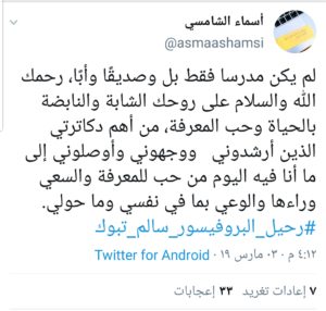 وقالت المغردة والقاصة أسماء الشامسية التي كانت من تلامذة الفقيد: لم يكن مدرساً فقط بل وصديقاً وأباً، رحمك الله والسلام على روحك الشابة والنابضة بالحياة وحب المعرفة، من أهم دكاترتي الذين أرشدوني ووجهوني وأوصلوني إلى ما أنا فيه اليوم من حب للمعرفة والسعي وراءها والوعي بما في نفسي وما حولي”.