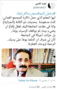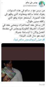 وتحدث المغرد يونس علي سالم عن سائق الفقيد الذي رافقه سنين طوالاً، وكتب قائلاً : من درس مع د. سالم في هذه السنوات، يعرف تماماً سائقه ومعاونه الذي يظهر في هذه الصورة.. أستشعر حزنه وهو الذي رافقه سنين طوال.. كان يدخل معه المحاضرات ويمشي معه في الممرات الضيقة الطويلة، ويجلس في مقدمة الفصل، وكان ذا ابتسامة جميلة. كيف هو حال قلبك الليلة؟ “.