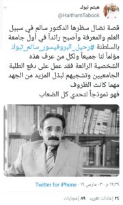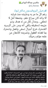 ووصف المغرد هيثم تبوك في تغريدة له الفقيد الرحل بالقول: ” قصة نضال سطّرها الدكتور سالم في سبيل العلم والمعرفة وأصبح رائداً في أول جامعة بالسلطنة. رحيل البروفيسور سالم تبوك مؤلم لنا جميعاً ولكل من عرف هذه الشخصية الرائعة، فقد عمل على دفع الطلبة الجامعيين وتشجيعهم لبذل المزيد من الجهد مهما كانت الظروف، فهو نموذج لتحدي كل الصّعاب”