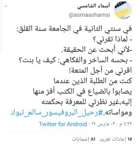 وأضافت الشامسية في تغريدة أخرى : ” في سنتي الثانية في الجامعة سنة القلق :