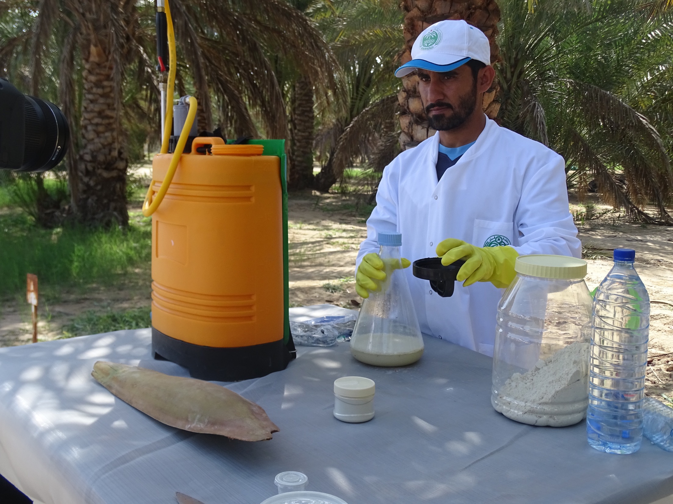 وحول هذا الموضوع أفاد الدكتور يوسف بن محمد الرئيسي – مدير مركز بحوث النخيل بالمديرية العامة للبحوث الزراعية والحيوانية بأن العملية التقليدية تتطلب الكثير من الوقت والجهد حيث تحتاج كل نخلة إلى فترة زمنية تتراوح بين 20 إلى30 دقيقة اعتمادا على غزارة الصنف وارتفاع النخلة، إضافة إلى كلفتها العالية حيث تقدر الكلفة بريال عماني واحد لكل نخلة كما أن أسعار أغاريض اللقاح مرتفعة حيث يتفاوت سعرها وفق آلية العرض والطلب فقد يبلغ سعرها 2-3 ريال في حين أنها قد تصل إلى 20 – 30 ريال في حالة ندرة المعروض للقيام بعملية تنبيت الأصناف المبكرة التي تتميز بها سلطنة عمان. وعليه فقد تم في قسم بحوث بستنة النخيل بمركز بحوث النخيل ابتكار تقنية الرش بالمعلق السائل ليكون بديلا سهلا ويسيرا من حيث الكلفة وسهولة وسرعة التنفيذ حيث لا تحتاج النخلة إلى أكثر من دقيقة إلى دقيقتين كل مرة وقد خضعت هذه التقنية للعديد من الدراسات منذ عام2004م وقد أثبتت جدواها في تحقيق نسب عقد مماثلة للتلقيح التقليدي.