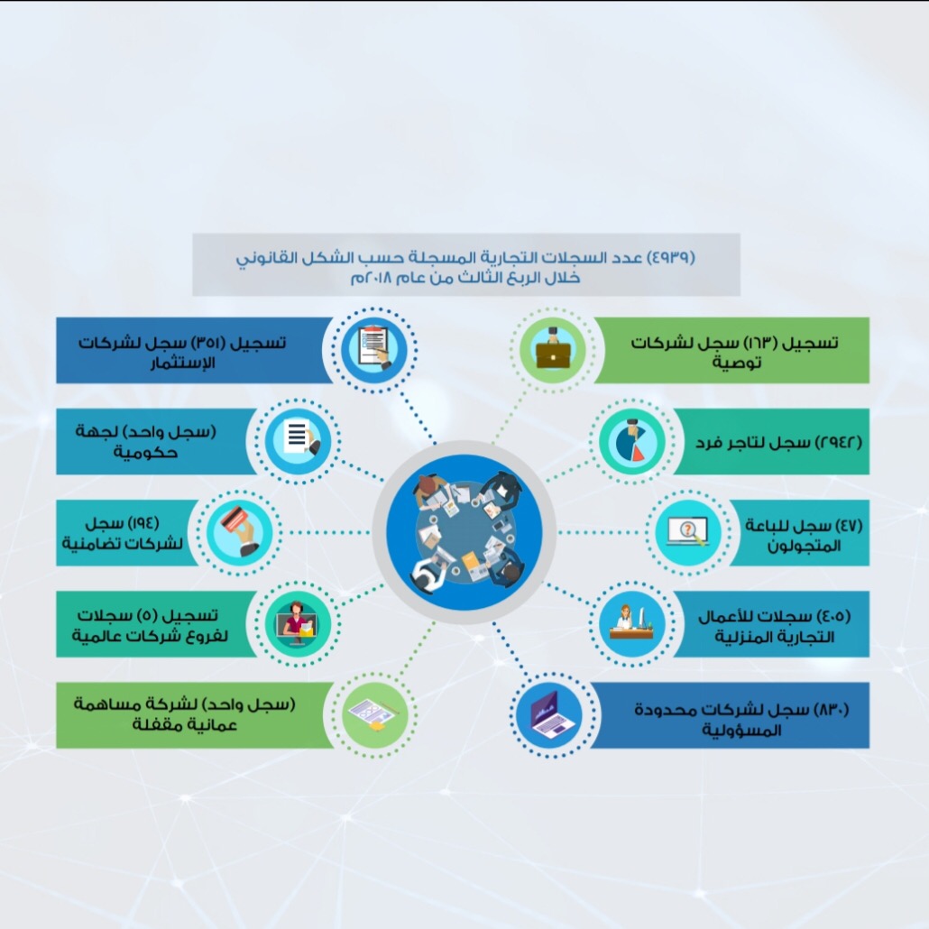 ووضحت وزارة التجارة والصناعة ممثلة في دائرة الاحصاء أن السجلات تمثلت في ألفين و(942) سجلا لتاجر فرد و(47) سجلا للباعة المتجولين و(405) سجلات للأعمال التجارية المنزلية، و(194) سجلا لشركات تضامنية، و(163) سجلا لشركات توصية و(830) سجلا لشركات محدودة المسؤولية، و(351) سجلا لشركات الاستثمار، و(5) سجلات لفروع شركات عالمية، وسجل واحد لشركة مساهمة عمانية مقفلة، وسجل واحد لجهة حكومية.