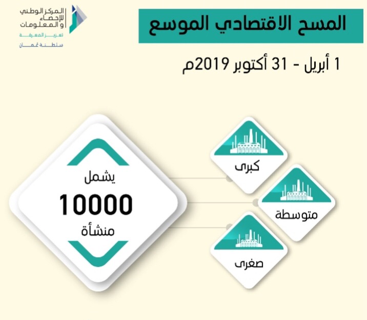 بدأ المركز الوطني للإحصاء والمعلومات اليوم بتنفيذ المسح الاقتصادي الموسع الذي يشمل المنشآت الاقتصادية كمصدر رئيسي لجمع البيانات ويستمر حتى 31 أكتوبر 2019.