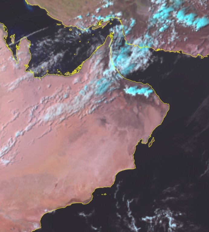 نشرت الهيئة العامة للطيران المدني على حسابها في موقع تويتر الصورة الجوية التي تُظهر سحب محلية على محافظات جنوب الباطنة والداخلية وشمال الشرقية مع هطول امطار متفرقة-رعدية في بعض المناطق- مع فرص امتداد بعض السحب الممطرة نحو أجزاء من محافظة مسقط وتدفق سحب متوسطة وهطول امطار متفرقة على محافظات مسندم والبريمي وشمال الباطنة والظاهرة.