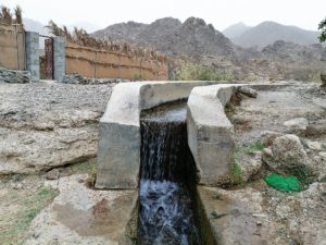ويعتمد الأهالي في ريّ مزارعهم على مياه الأفلاج، حيث يوجد بالبلدة “فلج الحلو” وهو من الأفلاج الداوودية ، وغزارة تدفق مياهه متوسطة لكنه لا ينقطع ودائم الجريان صيفاً وشتاءً، وكذلك “فلج المر” وهو عبارة عن مياه كبريتية تتدفق مياهها الحارة من باطن الأرض وهو أشبه ما يكون بعين الكسفة في ولاية الرستاق بمحافظة جنوب الباطنة، ومن مميزات هذا الفلج أن مياهه لا تنقص ولا تزيد سواءً مع وفرة الأمطار أو نقصانها، كما أنه يوجد في القرية عدد من العيون المائية كـ “عين المرة” التي صمم لها الأهالي قنوات صغيرة ودقيقة جداً نظراً لقلة مياهها.
