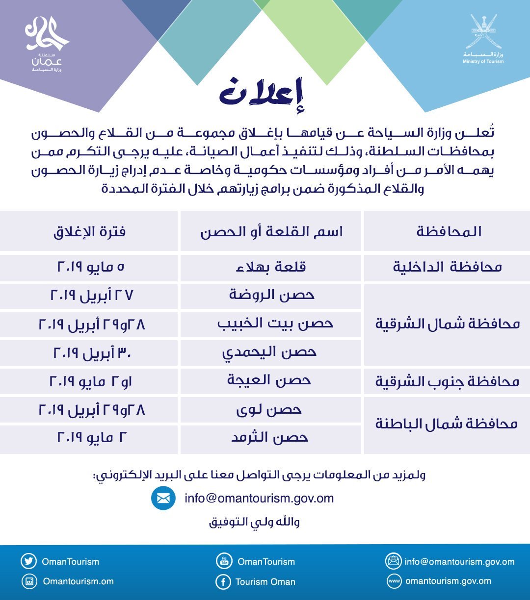 أعلنت وزارة السياحة عن قيامها بإغلاق مجموعة من القلاع والحصون في بعض محافظات السلطنة، وذلك لتنفيذ أعمال الصيانة، خلال الفترة المحددة.