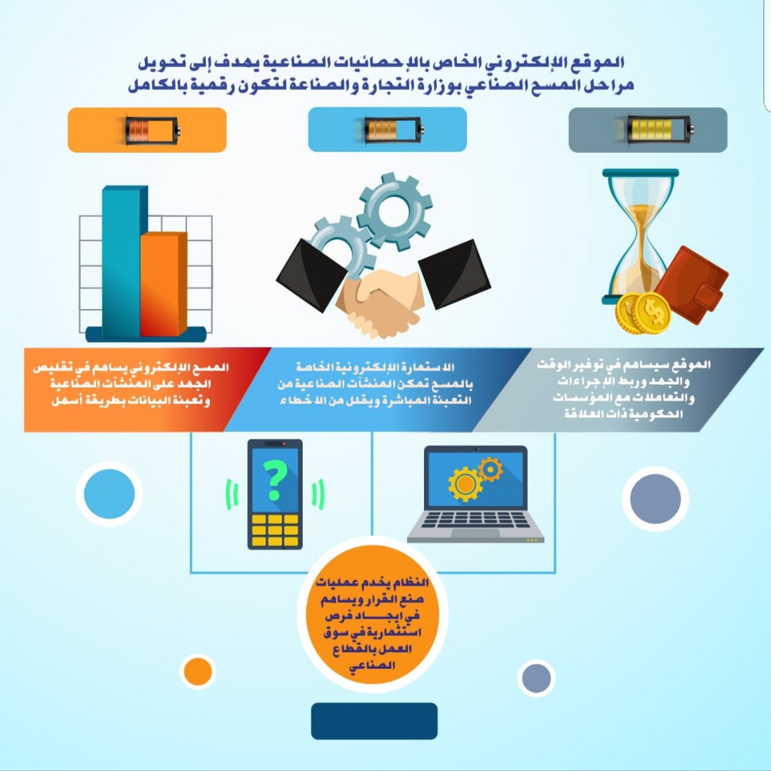 ووضح الساحب أن المسح الإلكتروني للمنشآت الصناعية سيساهم في سرعة ودقة الحصول على المعلومات إضافة إلى توفير الوقت والجهد وربط الإجراءات والتعاملات مع المؤسسات الحكومية ذات العلاقة وتقليص الجهد على المنشآت الصناعية وتعبئة البيانات بطريقة أسهل.