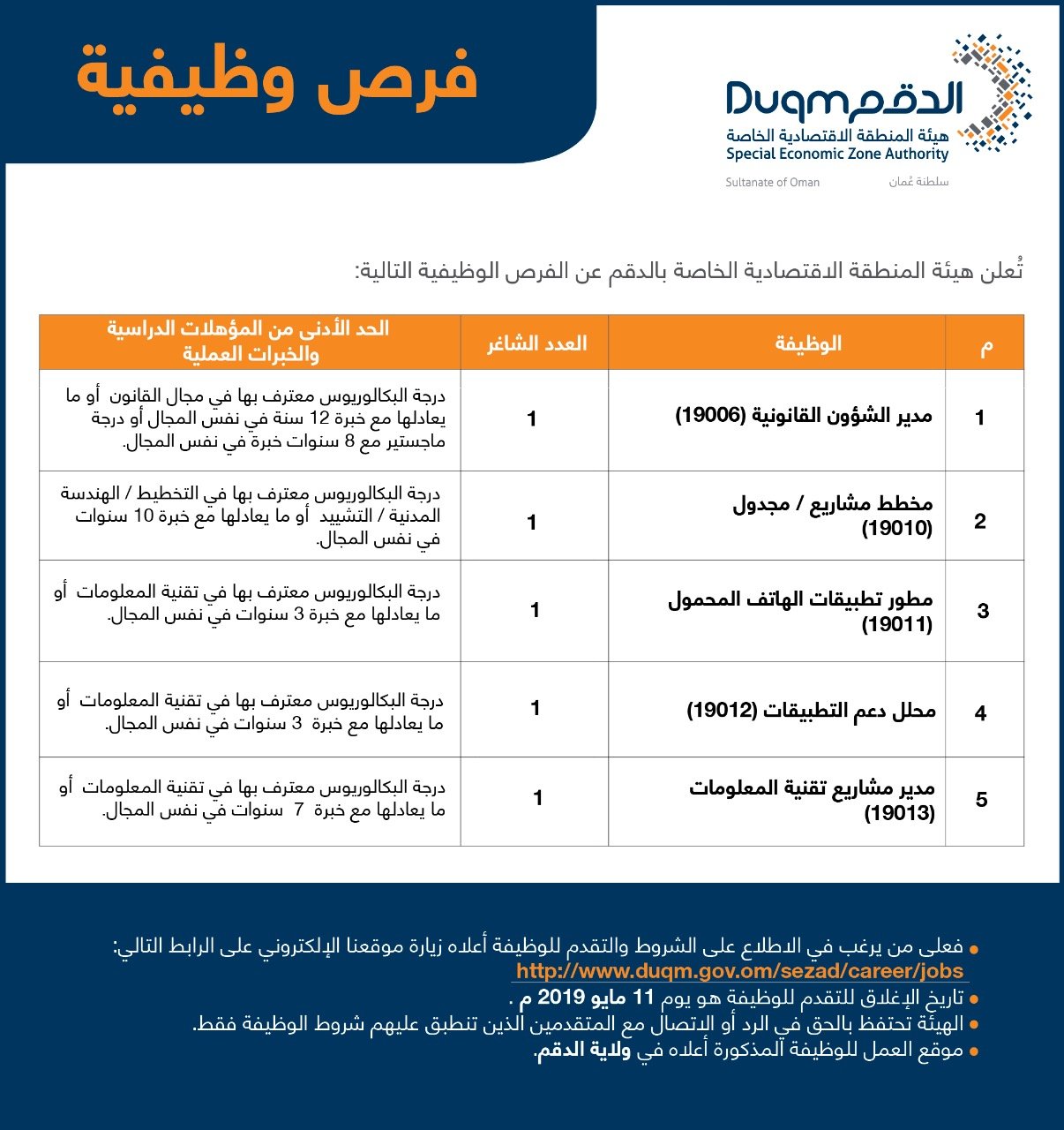 أعلنت هيئة المنطقة الاقتصادية الخاصة بالدقم عن مجموعة فرص وظيفة حسب الشروط المرفقة: