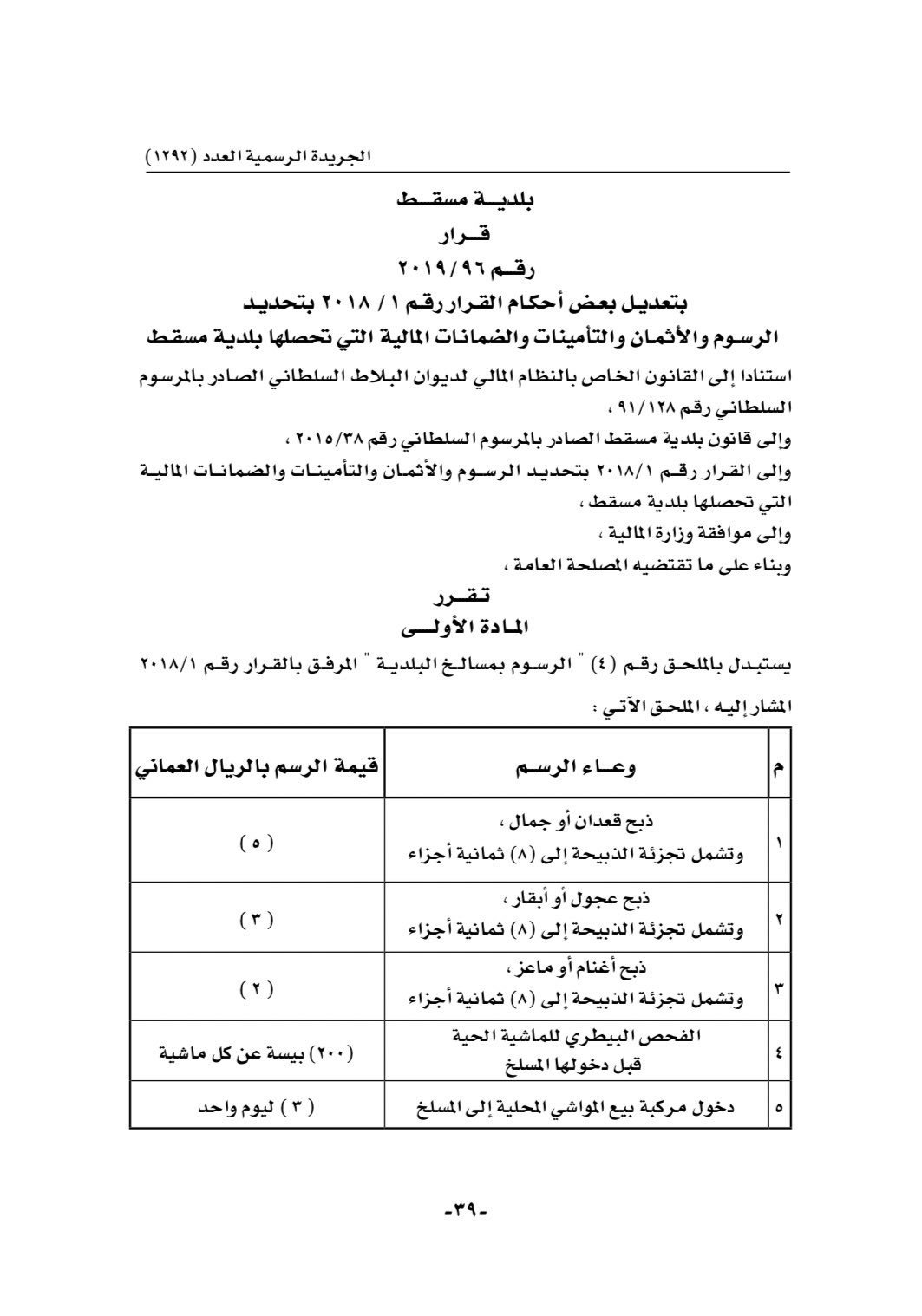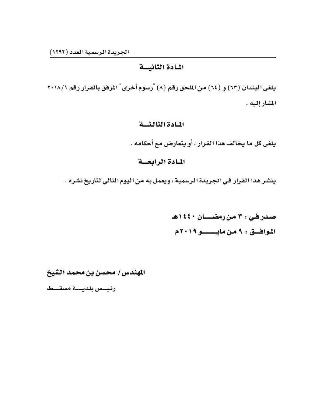 رصد- شؤون عمانية:أصدر معالي المهندس محسن بن محمد الشيخ رئيس بلدية مسقط قرارًا بتعديل بعض أحكام القرار رقم 1/ 2018 بتحديد الرسوم والأثمان والتأمينات والضمانات المالية التي تحصلها بلدية مسقط، وهذا هو نص القرار: