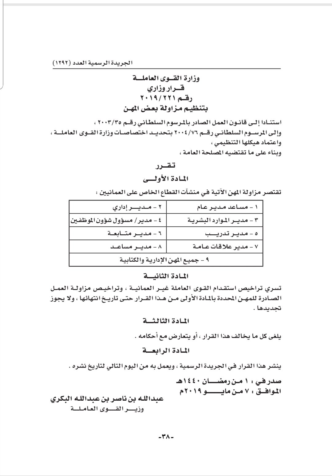 أصدر معالي الشيخ عبدالله بن ناصر بن عبدالله البكري وزير القوى العاملة قرارا وزاريا رقم 221 / 2019 بتنظيم مزاولة بعض المهن.