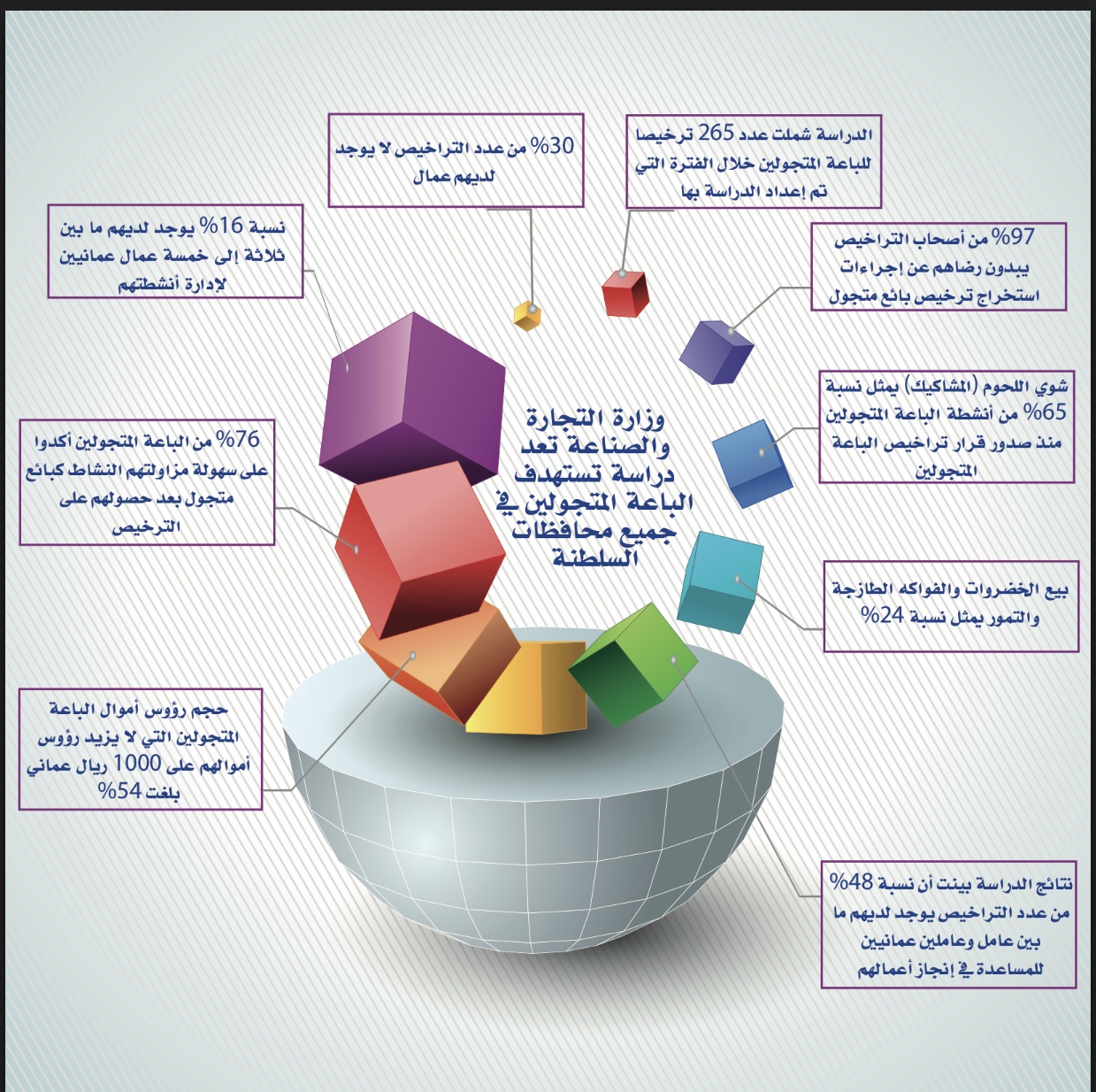 أوضحت دراسة ميدانية أعدتها وزارة التجارة والصناعة استهدفت الباعة المتجولين في جميع محافظات السلطنة بأن 97% من أصحاب التراخيص أبدوا رضاهم عن إجراءات استخراج ترخيص بائع متجول من وزارة التجارة والصناعة، حيث تركزت معظم التراخيص في محافظة مسقط، وأن أكثر الأنشطة التي حصلت على تراخيص لمزاولة العمل منذ صدور قرار تراخيص الباعة المتجولين هي نشاطي شوي اللحوم (المشاكيك) بنسبة 65% وبيع الخضروات والفواكه الطازجة والتمور بنسبة 24%.