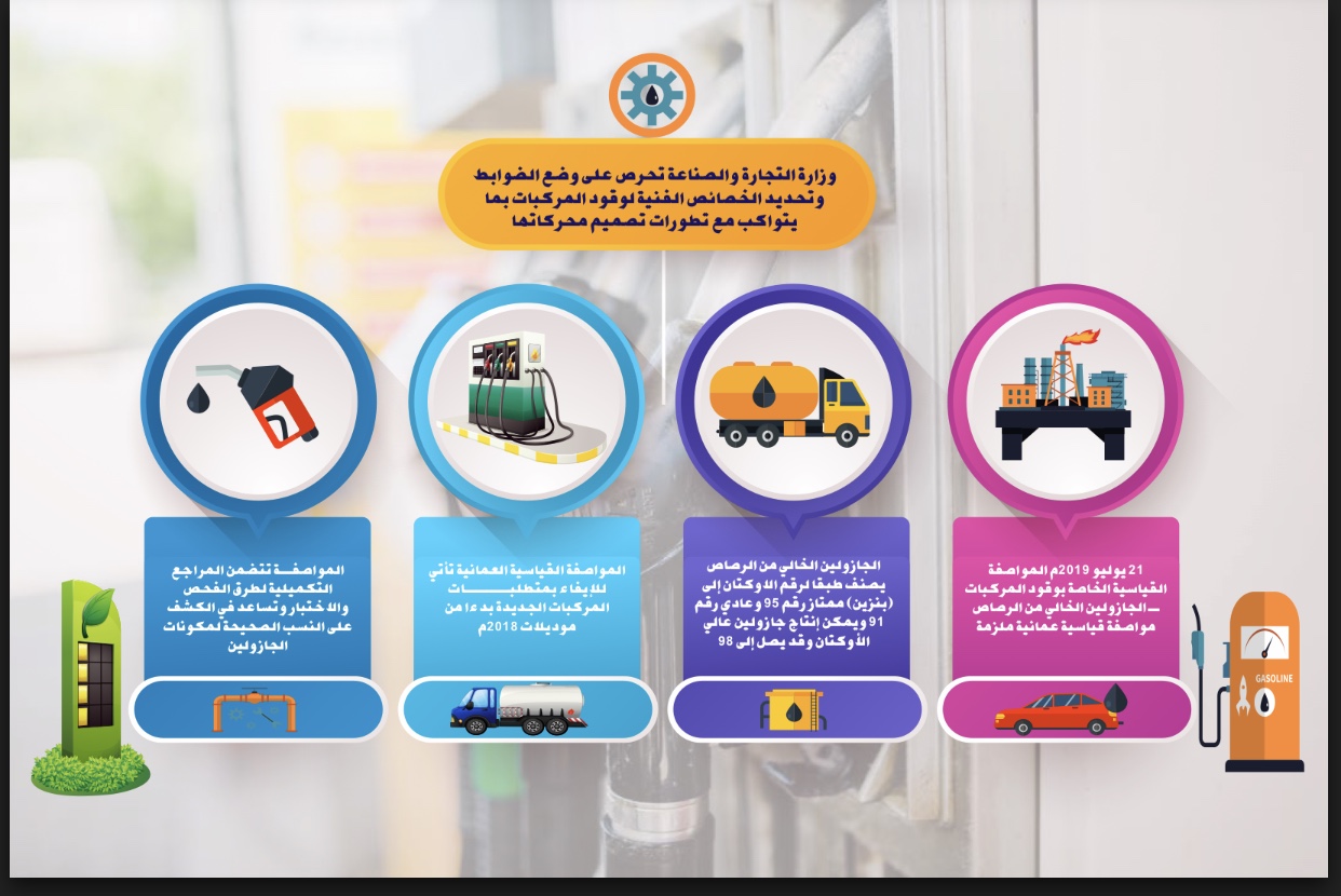 أعلنت وزارة التجارة والصناعة بأن القرار الوزاري بإعتبار المواصفة القياسية الخاصة بوقود المركبات ـ الجازولين الخالي من الرصاص مواصفة قياسية عمانية ملزمة سيدخل حيز التنفيذ في 21 يوليو الجاري ،حيث تم نشر القرار في الـ 20 من يناير 2019م والذي تم تحديد العمل بــه بعد 6 أشهر من تاريخ نشره.