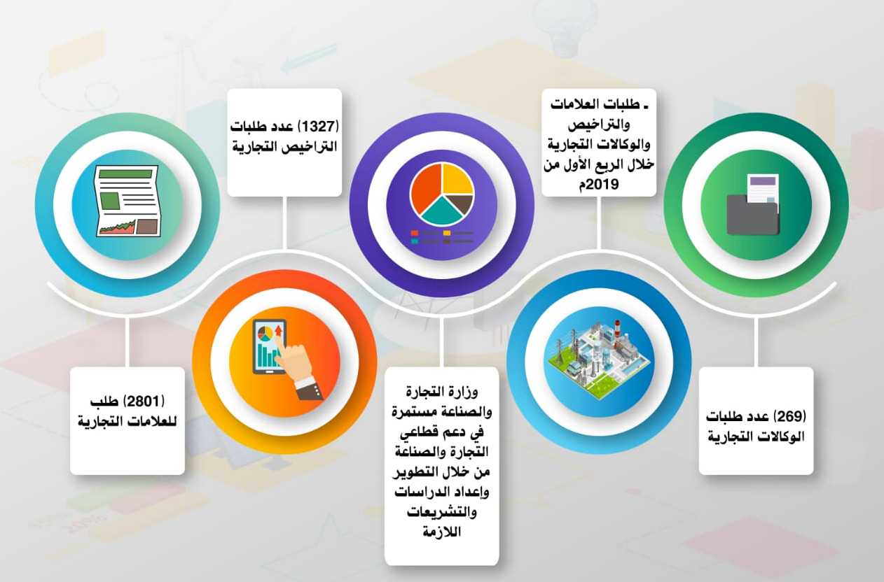 وأشارت دائرة الاحصاء بالوزارة بأن العلامات التجارية خلال الربع الأول من 2019م تمثلت في (2623) طلبا للعلامات التجارية و(116) طلبا في مجال البراءات و(6) طلبات للنماذج الصناعية و(56) طلبا لحق المؤلف.