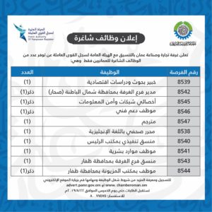 اعلنت غرفة تجارة وصناعة عُمان بالتنسيق مع الهيئة العامة لسجل القوى العاملة عن توفر عدد من الوظائف الشاغرة للعمانيين فقط:
