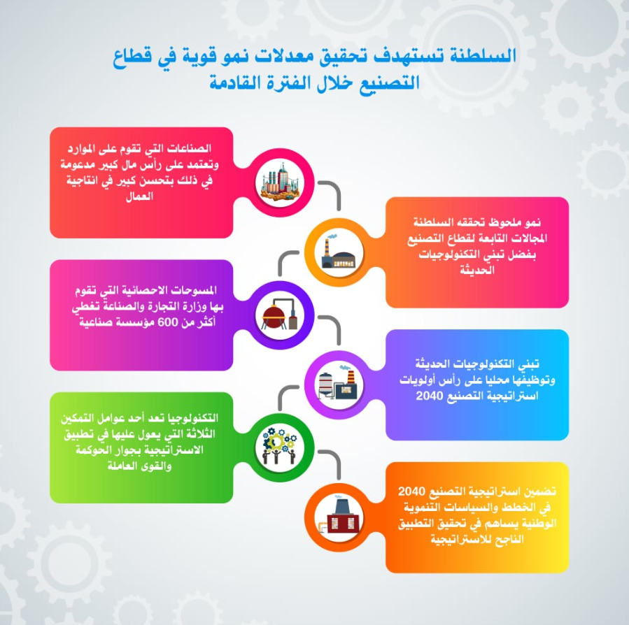 تسعى السلطنة إلى تحقيق معدلات نمو قوية في قطاع التصنيع خلال الفترة القادمة وذلك بفضل الجهود المستمرة لتشجيع تبني التكنولوجيات الحديثة في مجال الصناعة من أجل تحقيق التنوع الاقتصادي المطلوب وتفعيل دور القطاعات غير النفطية.