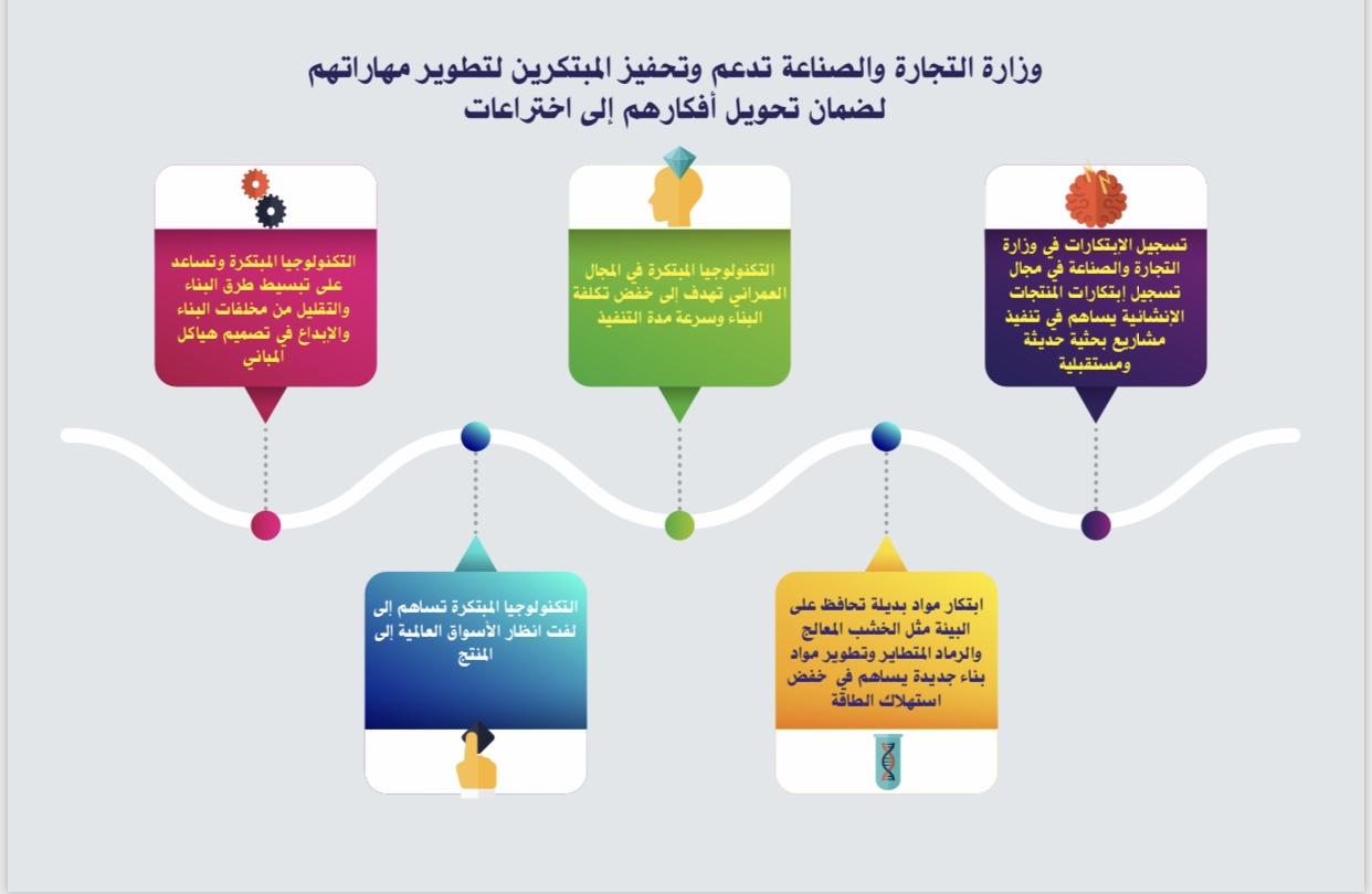تناشد وزارة التجارة والصناعة الأفراد والمؤسسات والشركات أصحاب الابتكارات في مجال المنتجات الإنشائية الخاصة بتقنية البناء الحديثة والمستقبلية على المبادرة بتسجيل ابتكاراتهم لدى دائرة الملكية الفكرية، وذلك لحمايتها من التعدي على المخترع دون تصريح منه باستغلال اختراعه.