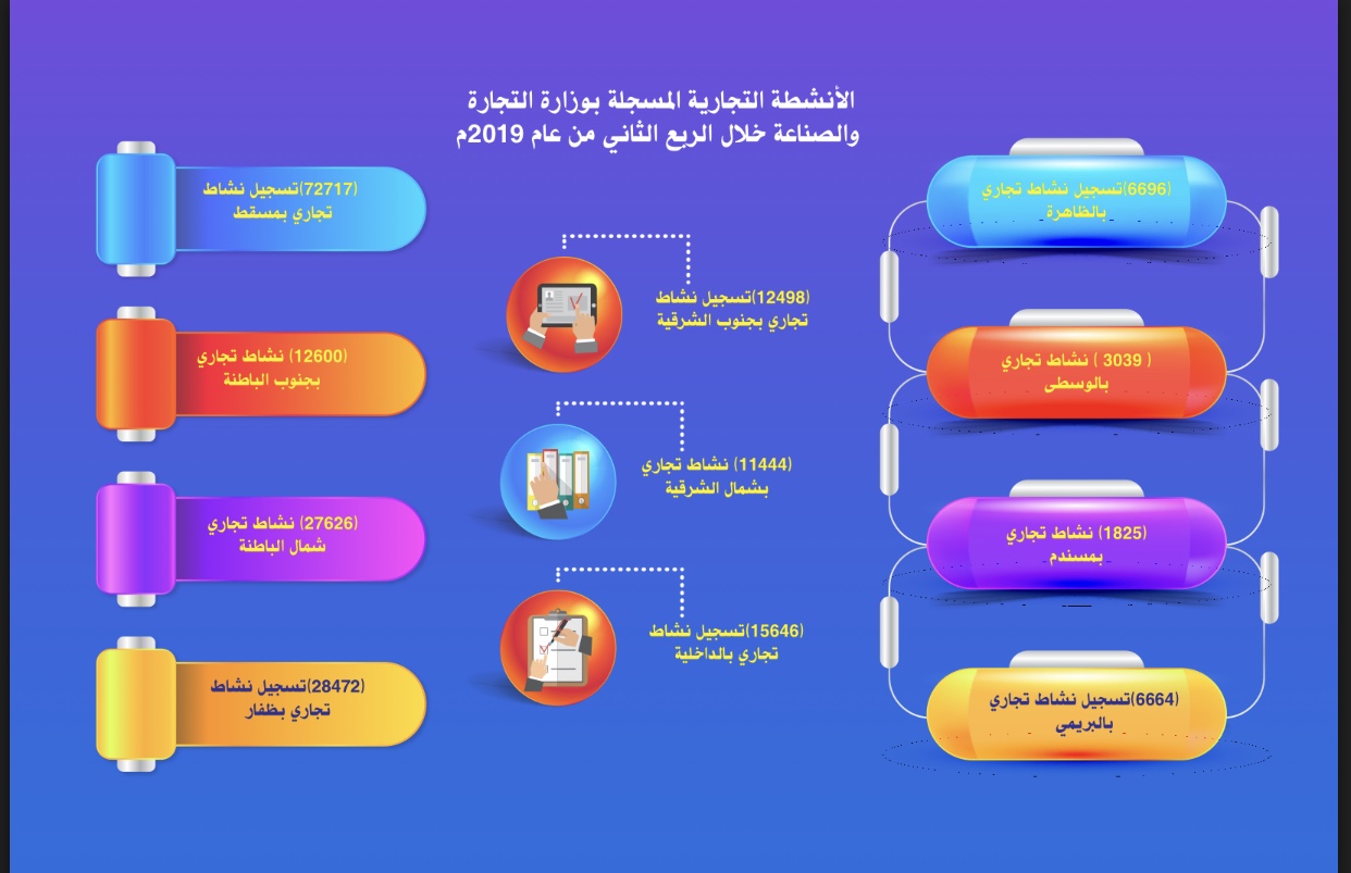 وأوضحت دائرة الاحصاء بالوزارة بأن عدد من الأنشطة التجارية التي تم تسجيلها خلال الربع الثاني من العام الحالي في محافظة مسقط بلغت 72 ألفا 717 نشاطا مقارنة 52 ألفا و943 نشاطا تم تسجيلها في الربع الثاني من العام 2018م ،تلتها محافظة ظفار بـ 28 ألفا و472 نشاطا مقارنة بـ 17 ألفا و773 نشاطا تم تسجيلها خلال نفس الفترة من العام الماضي، وجاءت ثالثا محافظة شمال الباطنة من خلال تسجيل 27 ألفا و626نشاطا تم تسجيلها في الربع الثاني من العام الحالي مقارنة بـ 26 ألفا و321 نشاطا تم تسجيلها في الربع الثاني من العام الماضي ،وحلت محافظة الداخلية رابعا من خلال تسجيلها 15 ألفا و646 نشاطا تم تسجيلها في الربع الثاني من العام الحالي مقارنة بـ 15 ألفا و196 نشاطا تم تسجيلها خلال نفس الفترة من العام الماضي،وجاءت محافظة جنوب الباطنة خامسا بتسجيل 12 ألفا و600 نشاطا خلال الربع الثاني من العام الحالي مقارنة بـ 10 آلاف و415 نشاطا تم تسجيلها خلال نفس الفترة من العام 2018م، وحلت محافظة جنوب الشرقية سادسا من خلال تسجيلها 12 ألفا و498 نشاطا تمت في الربع الثاني من العام الحالي مقارنة بـ 10 آلاف و456 نشاطا تم تسجيلها خلال الربع الثاني من العام الماضي ،وحلت سابعا محافظة شمال الشرقية من خلال تسجيل 11 ألفا و444 نشاطا في الربع الثاني من العام الحالي مقارنة بـ 10 آلاف و97 نشاطا تم تسجيلها في نفس الفترة من العام الماضي ،وجاءت محافظة الظاهرة ثامنا من خلال تسجيل 6 آلاف و696 نشاطا خلال الربع الثاني من العام الحالي مقارنة بـ 5 آلاف و437 نشاطا في الربع الثاني من العام 2018م ،وحلت محافظة البريمي تاسعا من خلال تسجيل 6 آلاف و664 نشاطا في الربع الثاني من العام الحالي مقارنة بـ 5 آلاف و880 نشاطا خلال نفس الفترة من العام الماضي ،وجاءت محافظة الوسطى عاشرا من خلال تسجيل 3 آلاف و39 نشاطا في الربع الثاني من العام الحالي مقارنة بـ ألفا و931 نشاطا في الربع الثاني من العام الماضي وحلت محافظة مسندم في المركز الحادي عشر من خلال تسجيل ألفا و825 نشاطا في الربع الثاني من العام 2019م مقارنة بـ ألفا و500 نشاطا تم تسجيلها خلال الربع الثاني من العام 2018م.