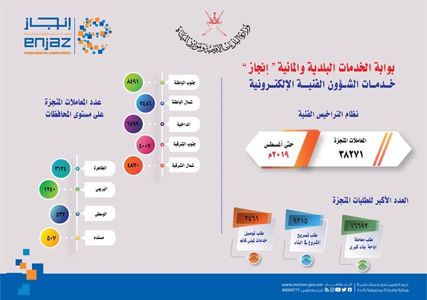 بلغ عدد المعاملات الإلكترونية التي تم إنجازها عبر البوابة الإلكترونية “إنجاز” لوزارة البلديات الإقليمية وموارد المياه والمتعلقة بخدمات الشؤون الفنية الإلكترونية حتى شهر أغسطس الماضي (٣٨٢71) معاملة بمختلف المحافظات الواقعة تحت نطاق إشرافها.