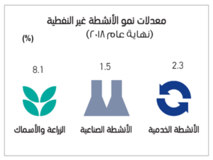 تشير البيانات الصادرة عن المركز الوطني للإحصاء والمعلومات إلى أن إجمالي القيمة المضافة للأنشطة غير النفطية بنهاية عام 2018 بلغ 20.8 مليار ريال عماني مسجلة مساهمة بـ67.7% في الناتج المحلي الإجمالي للسلطنة.
