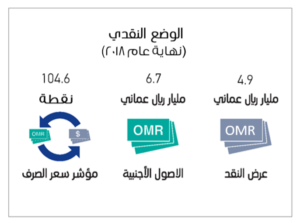 وفي مؤشرات الوضع النقدي ارتفع إجمالي السيولة المحلية (م2) بنهاية عام 2018م بنسبة 8.3% مسجلا نحو 17.4 مليار ريال عماني مقارنة بنحو 16.1 مليار ريال عماني في العام السابق، بينما انخفض عرض النقد (م1) بـ15.1 مليون ريال عماني مسجلا نحو 4.9مليار ريال عماني.
