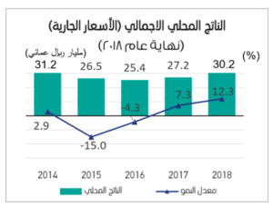 وبالمجمل نما الناتج المحلي الإجمالي بالأسعار الجارية بحوالي 12.3% حيث ارتفع من 27.2 مليار ريال عماني بنهاية عام 2017مإلى 30.5 مليار ريال عماني بنهاية عام 2018محيث يعزى هذا الارتفاع إلى ارتفاع متوسط سعر النفط من 51.3 دولار للبرميل بنهاية عام2017م إلى نحو 69.7 دولار للبرميل بنهاية عام2018م.