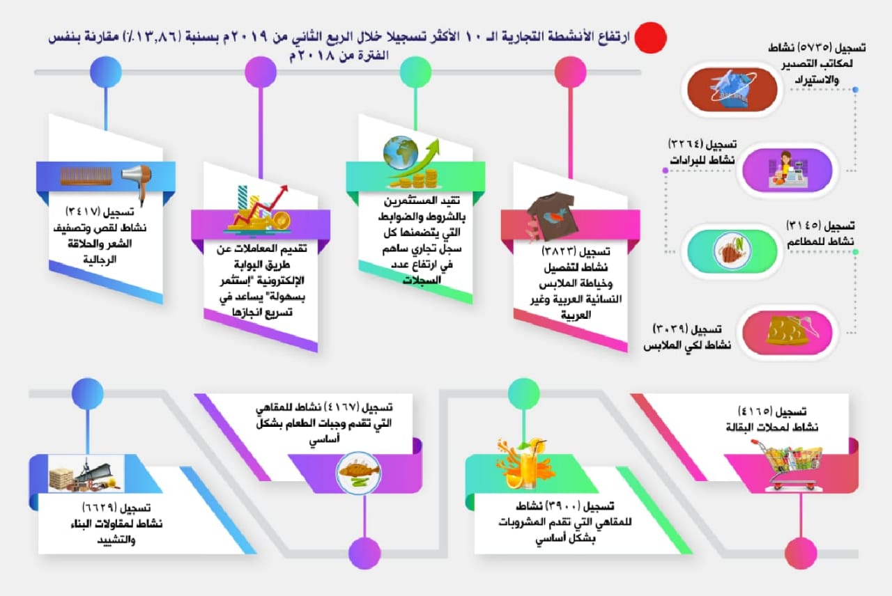 أشارت وزارة التجارة والصناعة بأن عدد الأنشطة التجارية العشرة الأكثر تسجيلا خلال الربع الثاني من العام الحالي بلغ 41 ألفا و284 نشاطا ،مقارنة بـ 36 ألفا و256 نشاطا تم تسجيلها خلال نفس الفترة من عام 2018م حيث سجلت ارتفاعا بسنبة 13.86 في المائة.