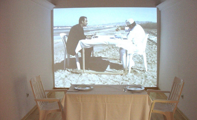 “تركيب الفيديو” التباس” للمخرج حسن المير يعرض شخصيتين يصورهما الفنان ، إحداهما ترتدي الدشداشة والأخرى ترتدي الزي الغربي. يتم عرض الشخصيتين على شاشة كبيرة وتتحدثا أمام عمل فني حقيقي يتكون من طاولة وكراسي. على الرغم من أن العمل يعكس مواضيع مماثلة لتلك الموجودة في “الهوية الجديدة” ، إلا أنه يمضي صدىً أكبر مع القضايا التي تدل على المفارقات الثقافية التي تجبر الفرد على الانقسام وإخفاء و “إعادة تمثيل” جوانب مختلفة من هويته بناءً على جمهوره المستلم و الفضاء أو المجال الذي يوجد فيه الفرد. وعلى المستوى الغيبي، يرى مير هذه المفارقة كحالة تشويش بين الرغبة والحركة ، استنادًا إلى امتلاك أدوات السعادة بينما تكون غير مهتم أو غير قادر على توظيفها. إنه يتنبأ بأن هذه الرغبات تتناقص إلى حد يستنفد الروح والجسد بينما تختفي أدوات “الرغبة السعادة” في الحياة ”