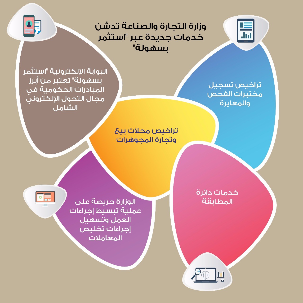 دشنت وزارة التجارة والصناعة خدمات التراخيص لتسجيل مختبرات الفحص والمعايرة وخدمات دائرة المطابقة وخدمات التراخيص لمحلات بيع وتجارة المجوهرات وذلك عبر البوابة الإلكترونية “استثمر بسهولة” وذلك من منطلق حرص الوزارة على عملية تبسيط إجراءات العمل وتسهيل إجراءات تخليص المعاملات.