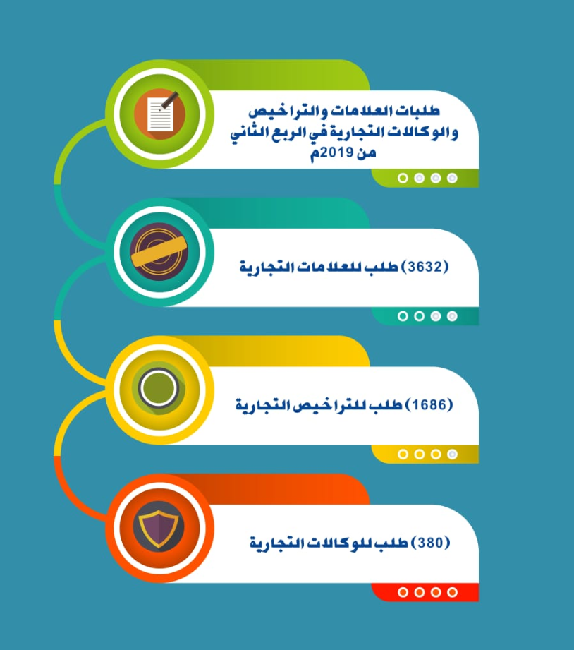 وأوضحت وزارة التجارة والصناعة بأن طلبات العلامات التجارية خلال الربع الثاني من 2019م سجلت ارتفاعا بنسبة 47.4 في المائة بتسجيل (3435) طلبا مقارنة بـ (2331) طلبا تم تسجيلها خلال الربع الثاني من العام الماضي ،وارتفعت طلبات البراءات بنسبة 11.4 في المائة عن العام الماضي بتسجيل (137) طلبا مقارنة بـ (123) طلبا تم تسجيلها نفس الفترة من العام الماضي ،كما ارتفعت طلبات حق المؤلف بنسبة 7.7 في المائة في الربع الثاني من العام الحالي بتسجيل (56) طلبا مقارنة بـ (52) طلبا تم تسجيلها خلال نفس الفترة من العام الماضي ،بالإضافة إلى تسجيل (4) طلبات للنماذج الصناعية خلال الربع الثاني من العام الحالي.
