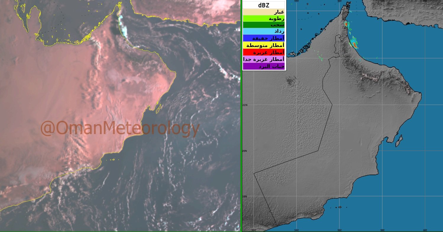 قالت الأرصاد الجوية على حسابها الرسمي في ” تويتر” أن الصورة الجوية توضح حاليا نشاط السحب الركامية الممطرة على سواحل شرق محافظة مسندم وسواحل شمال الباطنة قد تمتد لسواحل جنوب الباطنة لاحقا وانتشار السحب المنخفضة والضباب على أجزاء من سواحل بحر العرب وأجواء غائمة جزئيا على معظم محافظات السلطنة.