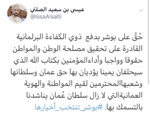 و قال المغرد عيسى بن سعيد الصلتي : حقٌ على بوشر بدفع ذوي الكفاءة البرلمانية القادرة على تحقيق مصلحة الوطن والمواطن حقوقًا و واجبًا و أداء المؤمنين بكتاب الله الذي سيحلفان يمينًا يؤديان بها حق عمان و سلطانها و شعبها المحترمين لقيم المواطنة والهوية العمانية التي لا زال سلطان عمان يناشدنا بالتمسك بها .