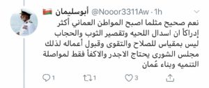 و علق أبو سليمان رداً على تغريدة منى العدوية قائلاً : نعم صحيح مثلما أصبح المواطن العماني أكثر إدراكًا أن إسدال اللحية وتقصير الثوب و الحجاب ليس بمقياس للصلاح و التقوى و قبول الأعمال ؛ لذلك مجلس الشورى يحتاج إلى الأجدر فقط لمواصلة تنمية و بناء عمان .