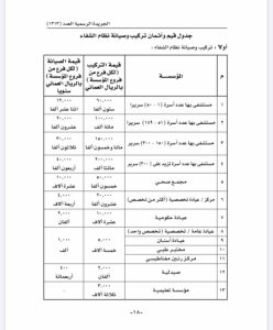 المادة الأولى : تحدد قيم و أثمان تركيب وصيانة نظام الشفاء و الأنظمة المرتبطة به وفق الجدول المرفق .