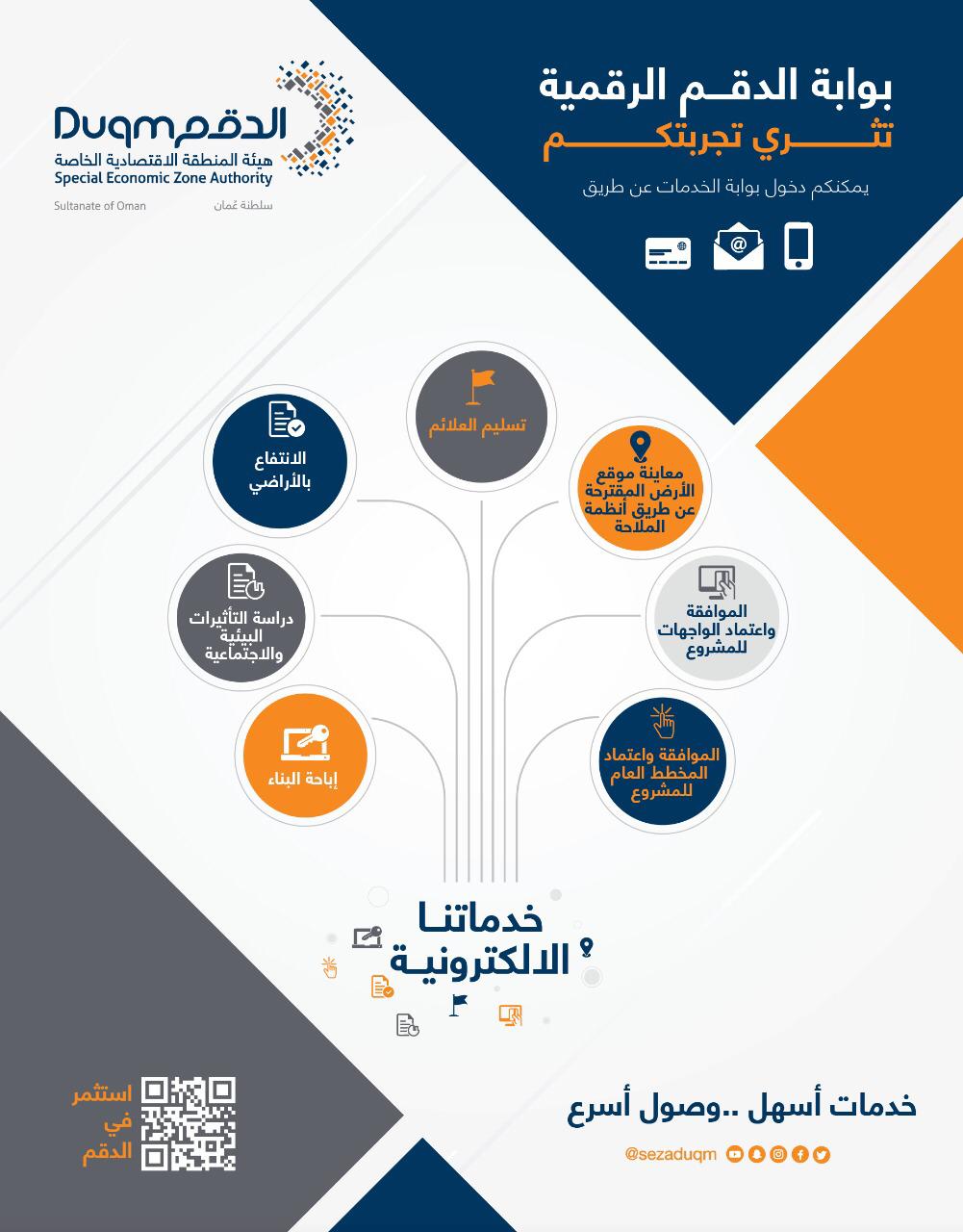 أطلقت هيئة المنطقة الاقتصادية الخاصة بالدقم (اليوم 16 اكتوبر 2019م) عدد من الخدمات الالكترونية الجديدة ضمن مجموعة الخدمات المقدمة عبر بوابتها الرقمية (www.eoss.duqm.gov.om) وتمثلت الخدمات الجديدة التي أقرتها اللجنة الرئيسية للتحول الرقمي مؤخرا في : خدمة طلب الانتفاع بالاراض وخدمة طلب اباحات البناء ، وخدمة تقديم دراسات التأثيرات البيئية والاجتماعية، وخدمة تسليم العلائم ، وخدمة معاينة موقع الارض المقترحة عن طريق انظمة الملاحة ، وخدمة طلب اعتماد واجهات المشروع ، وكذالك خدمة الموافقة واعتماد المخطط العام للمشروع.