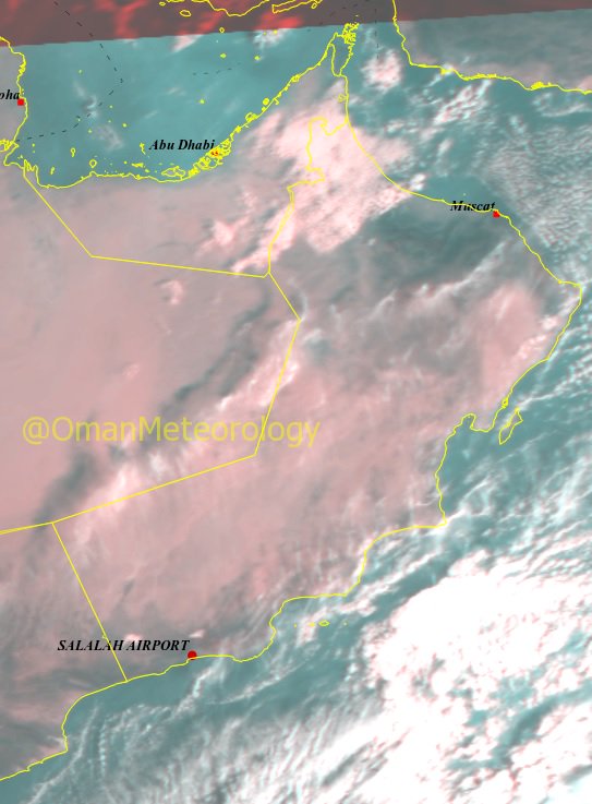 قالت المديرية العامة للأرصاد الجوية أن الصورة الجوية توضح تدفق السحب على الأجزاء الشمالية الغربية للسلطنة (محافظات مسندم و شمال الباطنة والبريمي والظاهرة ) مع تواجد للسحب المنخفضة على أجزاء من سواحل بحر عمان وبحر العرب.