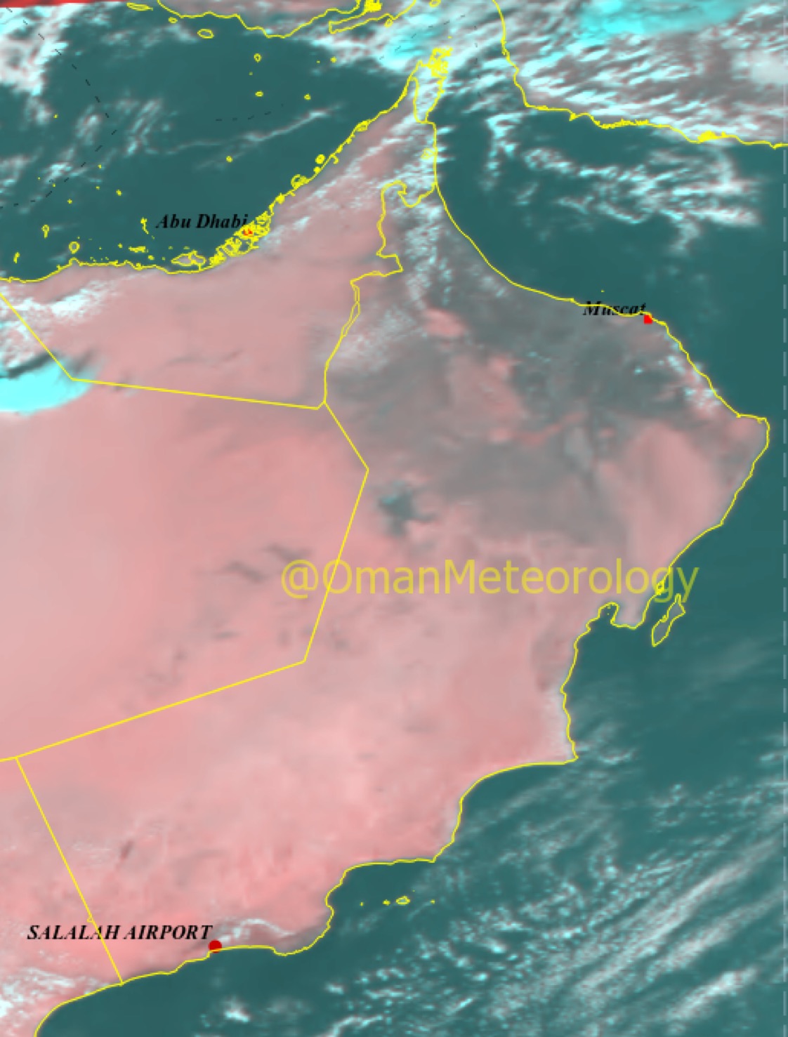 قالت الأرصاد العمانية أن الصورة الجوية تظهر استمرار تدفق السحب على محافظة مسندم مع هطول امطار متفرقة متفاوتة الغزارة وتكاثف السحب على جبال الحجر الغربي والمناطق المجاورة.