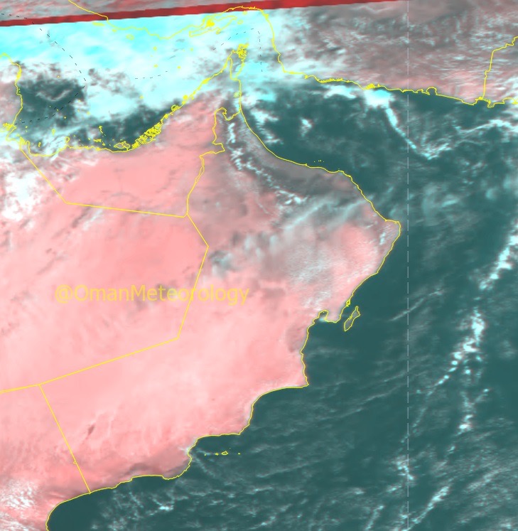 قالت الأرصاد العمانية بأن آخر الصور الجوية توضح استمرار تدفق السحب على محافظتي مسندم وشمال الباطنة وتشكل السحب على أجزاء من جبال الحجر .