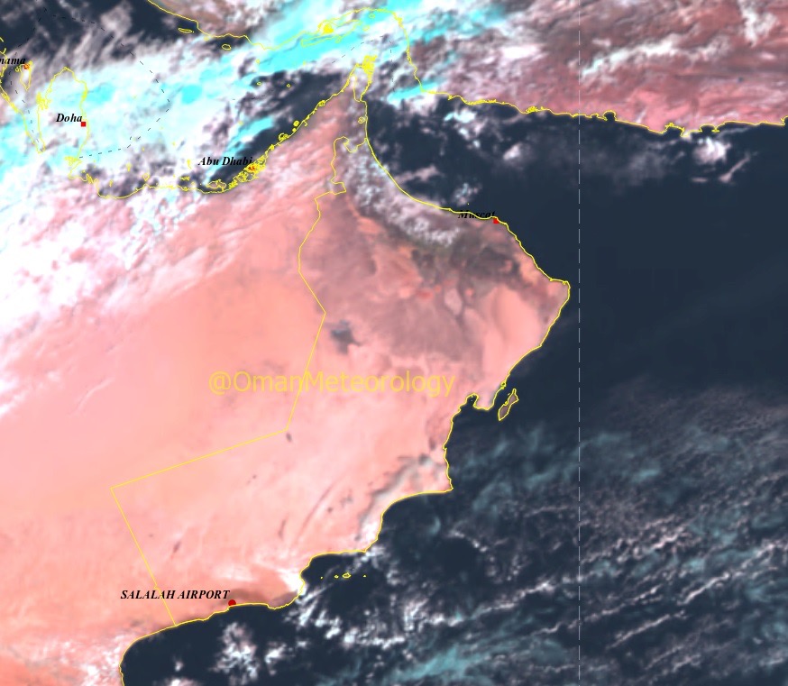 قالت الأرصاد العمانية بأن الصورة الجوية توضح تكاثف السحب على محافظتي مسندم وشمال الباطنة مع هطول أمطار متفرقة و تشكل السحب على جبال الحجر