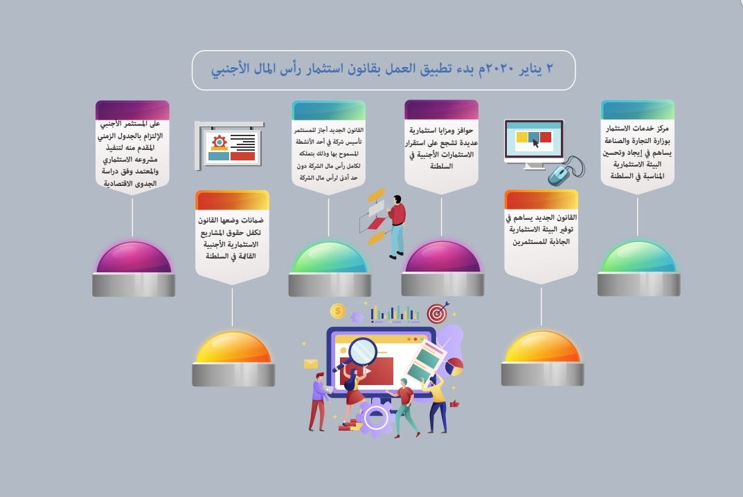 تبدأ وزارة التجارة والصناعة يوم الخميس الموافق 2 يناير 2020م تطبيق العمل بقانون استثمار رأس المال الأجنبي الصادر بموجب المرسوم السلطاني رقم 50 /2019، وذلك وفقا لما نصت عليه المادة الخامسة من ذات المرسوم. حيث أشارت المادة أن يكون تطبيق القانون بعد انقضاء (6) أشهر من تاريخ نشره في الجريدة الرسمية.