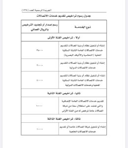 المادة الأولى : تحدد رسوم تراخيص تقديم خدمات الاتصالات وفقًا للجدول المرفق .