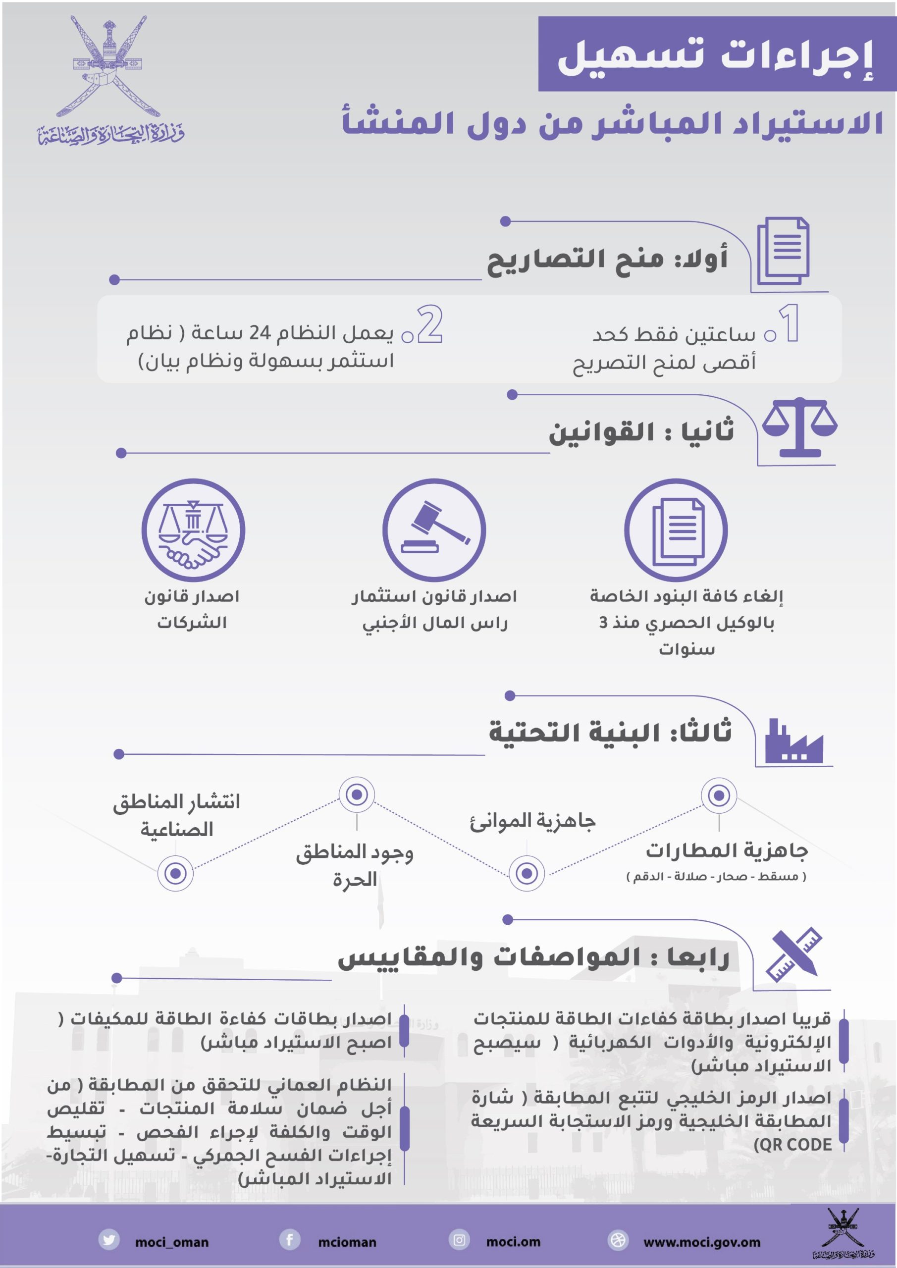 وقال مبارك بن محمد الدوحاني مدير عام التجارة بالوزارة بأنه من أجل التسهيل على المستوردين والمصدرين فقد قامت الوزارة وخلال السنوات الثلاث الماضية بإلغاء كافة البنود الخاصة بالوكيل الحصري وكذلك منح التصاريح اللازمة للإفراج عن البضائع من الموانئ العمانية والمنتشرة في كافة سواحل السلطنة خلال ساعتين فقط كحد أقصى منذ تقديم الطلب عبر نظام بيان الإلكتروني مما أتاح لجميع الموردين من المؤسسات الكبيرة والصغيرة والأفراد الاستيراد مباشرة ودون قيود.