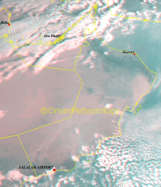 قالت المديرية العامة للأرصاد الجوية أن الصورة الجوية توضح تدفق السحب على الأجزاء الشمالية الغربية للسلطنة (محافظات مسندم وشمال الباطنة والبريمي والظاهرة) مع فرص لأمطار متفرقة لاحقا على مسندم وشمال الباطنة كما توجد السحب المنخفضة على أجزاء من محافظات جنوب الشرقية والوسطى وظفار